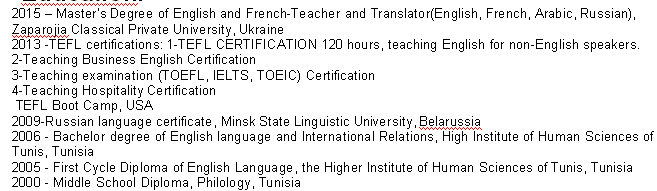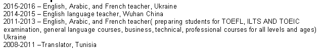 突尼斯 英语专业本科 TEFL 有教商务英语的证书 教TEFL 雅思等考试的证书 现在乌克兰 5年经验 1年在武汉 喜欢教成人,小孩也行,需要办工签 可以尽快来