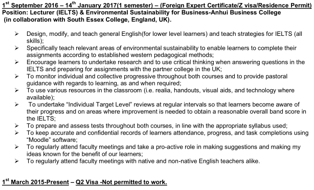 爱尔兰 现在安徽芜湖 工签转聘 一月份结束合同 可以教EAP经济学 雅思托福 商务英语 教过大学高中 还担任过大学的教务主任 求职下学期